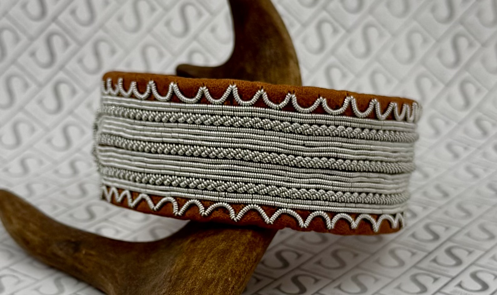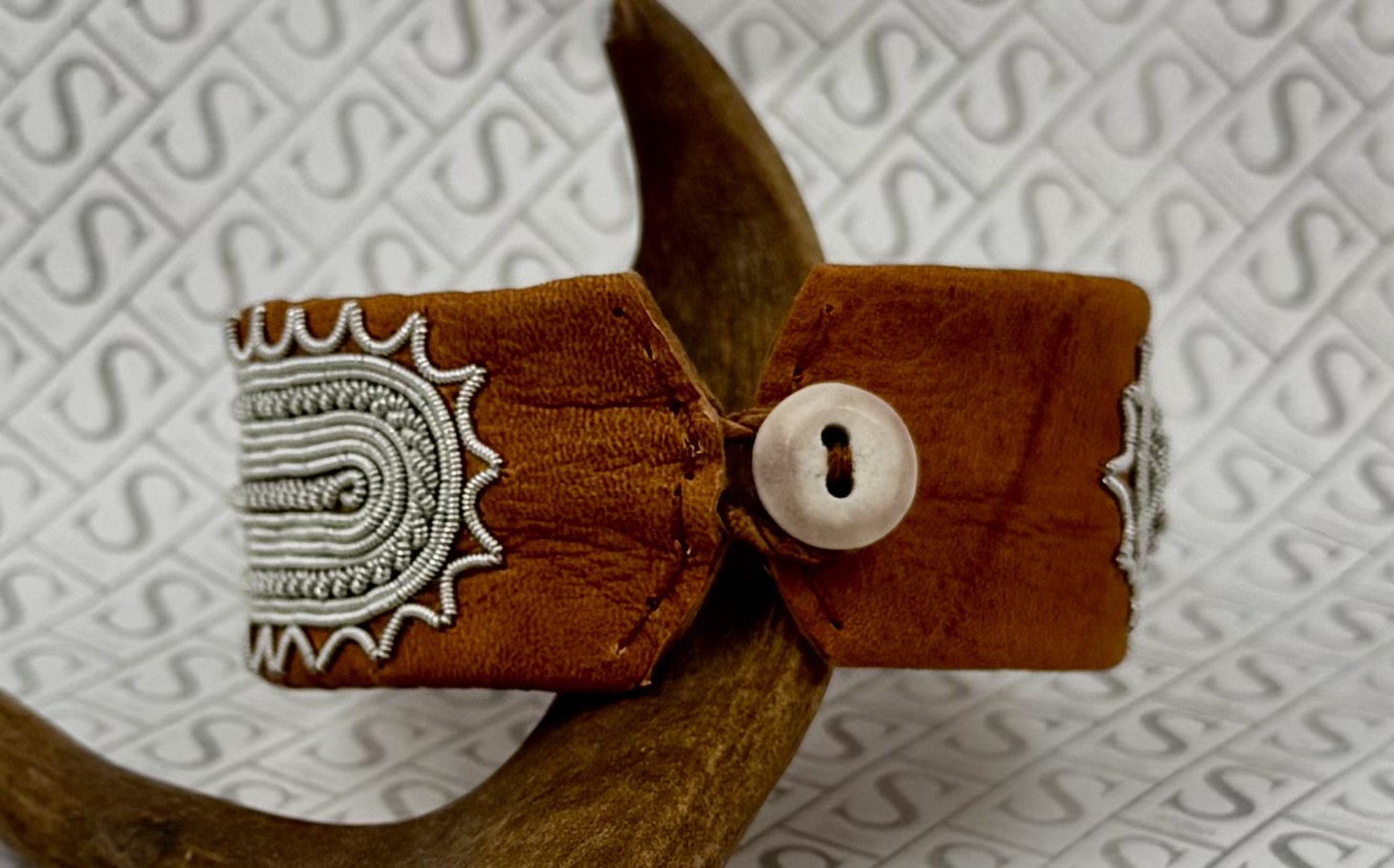 Tennarmband med broderat mönster i tenntråd, bilden visar handgarvat skinn.